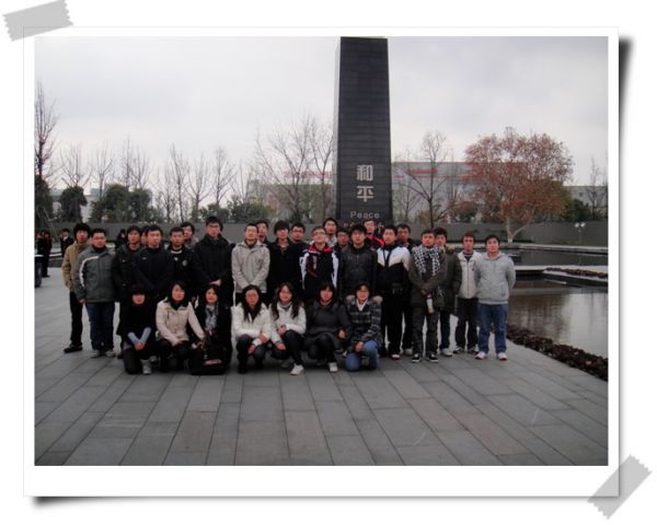 2009年12月16日,我支部全体成员前往侵华日军南京大屠杀遇难同胞纪念馆学习参观。下了校车后,大家都自觉保持一致地静默与肃穆,深深的感怀72年前这块土地上那沉重的历史痕迹。首先,我们参观了史料陈设馆。进入展厅,我们看到了大屠杀期间一些珍贵的历史文物,有被杀害的中国人民的骸骨,有一些已经锈迹斑斑的凶器:短刀、刺刀、甚至铁钉,这些都是日本侵略者对中国人民犯下不可饶恕罪过的铁一般的证据。当我们看到70年前成千上万的中国人被惨不忍睹地埋葬的“万人坑”时,我们的心情更加沉重了。让我们牢记那段屈辱的历史和抗战胜利的历史!馆内的一个12秒装置:两整面墙的人像照片,随着12秒的时间流逝,依序点亮,再依序熄灭。12秒一个生命消亡,30万的生命在短短几周的时间以这样的速度逝去,这给生人是怎样的悲恸。接着我支部全体成员组织了默哀仪式,并为死者献上鲜花。走出史料馆,伴随着悲伤的音乐,我们来到了一片水池前,对面一个很大的塑像:一个女人抱着一个小孩手里放着和平鸽,柱子上写着两个大字,和平.此时,大家不约而同地停留下来为死者祈福,默哀。