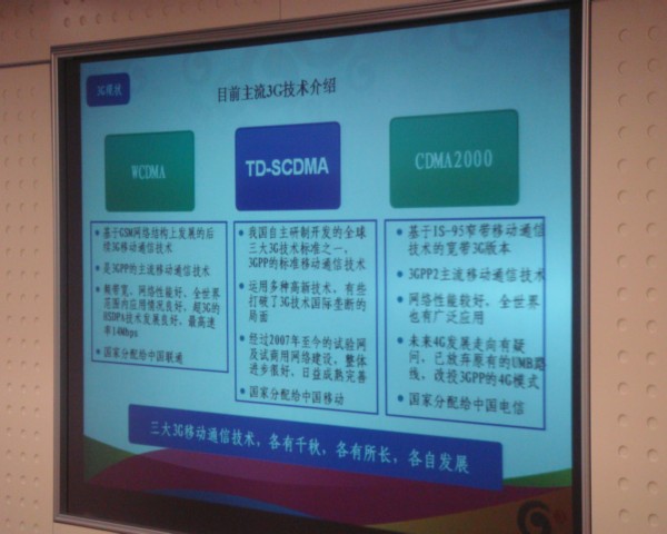 之后,江苏移动网络管理中心的刘工程师对目前较热门的3G技术进行了详细介绍,对WCDMA,CDMA200以及TD-SCDMA进行了对比,并将中国移动在TD-SCDMA研发各阶段所经历的细节生动展现给支部成员。