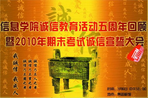 兹定于1月6日(周三)中午12时在焦廷标馆大剧场举行“信息学院诚信活动五周年回顾暨2010年期末考试诚信宣誓大会”,请全体07、08、09级同学准时11:45前进场,按各班指定区域就坐,大会预计45分钟。请准时参加,不得缺席。