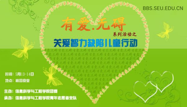 2010年5月16日是第二十次全国助残日。在全国助残日来临之际,太阳成集团tyc9728团委响应团中央的号召,在南京团市委和太阳成集团tyc9728团委的指导下,并在爱德基金会的帮助下,举办这次“‘有爱.无碍’系列活动之关爱智障同胞行动”,旨在倡议社会各界人士用爱心呵护智障同胞这个与我们同在一片阳光下的群体,让他们跟我们一样能够拥有快乐和理想!同在阳光下,你我一家人!