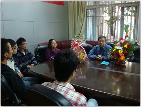 对《计算机结构与逻辑设计》的学习和体会,让我们对课本的编者黄正瑾老师充满了尊敬,而今天终于如愿见到了本人。 68岁的黄老师精神矍铄,是一名和蔼可亲并富有思想的长者。为了表达敬意,我们送上了精心挑选的花篮和水果篮,同时也将亲手制作并写有040096班全体同学祝福的卡片册送给了黄老师。这份“礼轻”背后的深重情意,缓缓地流淌于会议室,气氛十分温馨。