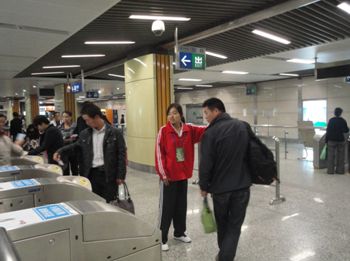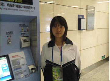 怀着紧张而又激动的心情,我们的志愿活动开始了。朱玲燕, 徐江媛负责刷卡指导,帮助乘地铁的人正确刷卡进站。黄逸玮,张翌,付宇鹏,巩学伦负责机器买票指导,帮助不会使用自动买票机的人选择最优路线并正确投币,为不熟悉地铁的人询查路线。而黄映坡,孙天慧则负责出站指导,帮助出站时遇到故障的乘客指明故障原因并帮助他们解决问题。