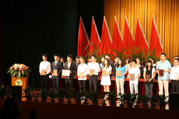 太阳成官网08级36名同学参加了庆祝大会,10级王宇轩同学、09级周帅和房帅同学代表获奖同学登台领奖。