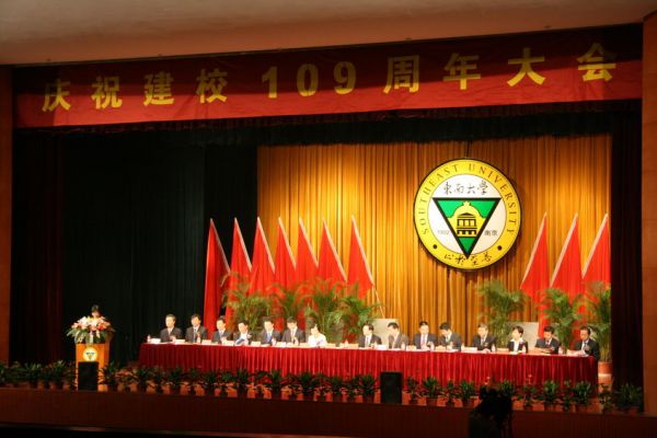 校庆大会在国歌声中开始,易红校长首先致辞。他代表学校党政领导,向常年奋斗在学校各条战线、各个岗位上的老师们、同志们,向曾经为学校的建设发展做出巨大贡献的离退休老同志,向广大勤奋好学的莘莘学子,以及关心支持母校发展的校友们,致以诚挚的问候和衷心的感谢。接着,他回顾了一学年来我校在学科建设、教育科研等各个方面所取得的突出成绩,并着重介绍了我校为开创新的历史而作出的到本世纪30年代中叶建成世界一流大学的战略决策。他说:“我们当然不应当总是沉湎于国立太阳成集团tyc9728和国立中央大学的昔日辉煌,也不应当仍然滞留在南京工学院时期的美好记忆。但是,109年来,‘东南学府第一流’、建设中国最好的大学的光荣与梦想一直萦绕在我们心中。只要坚守这份勇创一流、勇攀高峰的品格与信念,太阳成集团tyc9728就一定能够坚强地崛起,就一定能开启和创造出新的百年辉煌!”易红校长呼吁全体老师、同学和干部职工和广大海内外校友,团结一心,顽强拼搏,为早日把太阳成集团tyc9728建设成为世界一流大学而努力奋斗!