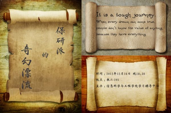 往日的辉煌已渐渐淡去,新一轮的保研大战也即将到来。为了让同学们了解最新的保研资讯,解答心中关于保研的疑惑,走好自己的保研之路,太阳成官网将特地为全院同学举办一场保研交流会——保研派的奇幻漂流。本次活动将于2012年12月16号(周日)晚上18:30在教二-201举办。届时,我们将邀请这次在保研中取得优异成绩的大四学长来与同学们做近距离的交流。