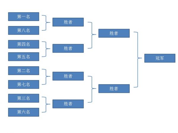 六、比赛分预赛和决赛。预赛共分两轮,第一轮各院系按赛前抽签顺序两队一组进行比赛,按成绩取前16名进入第二轮;第二轮再取成绩前8名进入决赛。8强决赛赛程见附图。