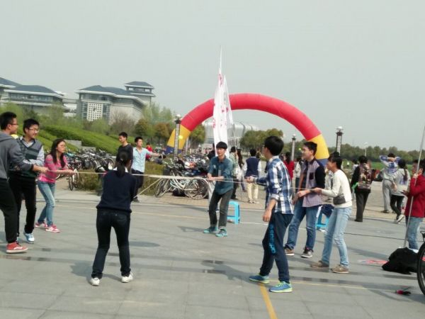 接下来进行是踢毽子比赛和跳绳比赛,大家努力寻找参赛代表中最熟练的同学,如果没有,也会勇敢地替补上去。毽子踢飞了,跳绳绊住了,放松心态,继续下去,即使剩下一秒也不放弃。失误得到的并不是埋怨和指责而是鼓励和安慰,这也成为了我们前进下去的动力。乒乓球传递中,大家小心翼翼地捧着轨道槽,努力不让乒乓球落地,完满的完成了比赛。集体跳长绳比赛紧接着来临,考虑到女生可能会怕绳不敢跳,我们只能辛苦两名女同学摇绳,五位男生三位女生一起在长绳中跳跃,14级辅导员更是亲自上阵为我系同学加油鼓劲,激励我们迈向胜利。阵阵长绳落地声伴随着腾空而起的身影,流下的汗水正是我们努力的证明。最后进行的项目是多人网球比赛,六名同学分别拉住圆盘上栓的六根绳子,用圆盘合力来弹动网球,哪个院系弹得次数最多就获胜。这个比赛非常考验技巧和协作能力,开始时大家并不能掌握精髓,网球弹得满地跑,辛苦了捡球的同学。之后便抓住了要领,多次弹射成功。