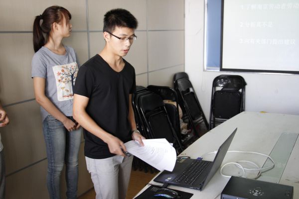 第二组答辩的是南京劳动保障与福利社会团队,他们走访调查了南京的劳动者发现在南京工作的劳动者大都能在工作前签署书面劳动合同,在五险一金和加班问题上他们也发现企业存在一些漏洞。在答辩中他们表示此次社会实践最为遗憾的是虽然通过调查发现了企业在劳动者保障和福利上的问题但在交涉中并没有得到有关的答复。