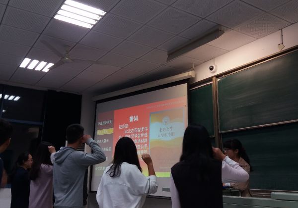晚上六点三十分,主持人杨宇峰同学准时宣布国奖、校奖答辩开始。各位候选人首先进行诚信宣誓,张婧媛同学领誓,15位候选人一起宣誓“我宣誓:此次在国家奖学金,校长奖学金评选中所提供的参选材料真实有效,愿意公平公开地参与竞选并接受大家的监督”,严肃而庄重的宣誓,显示了他们的真诚和态度。宣誓结束后,候选人以事先抽签的顺序依次登台展示。